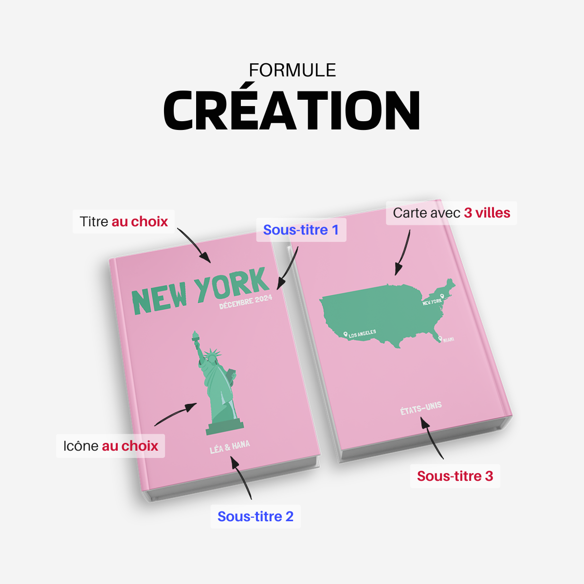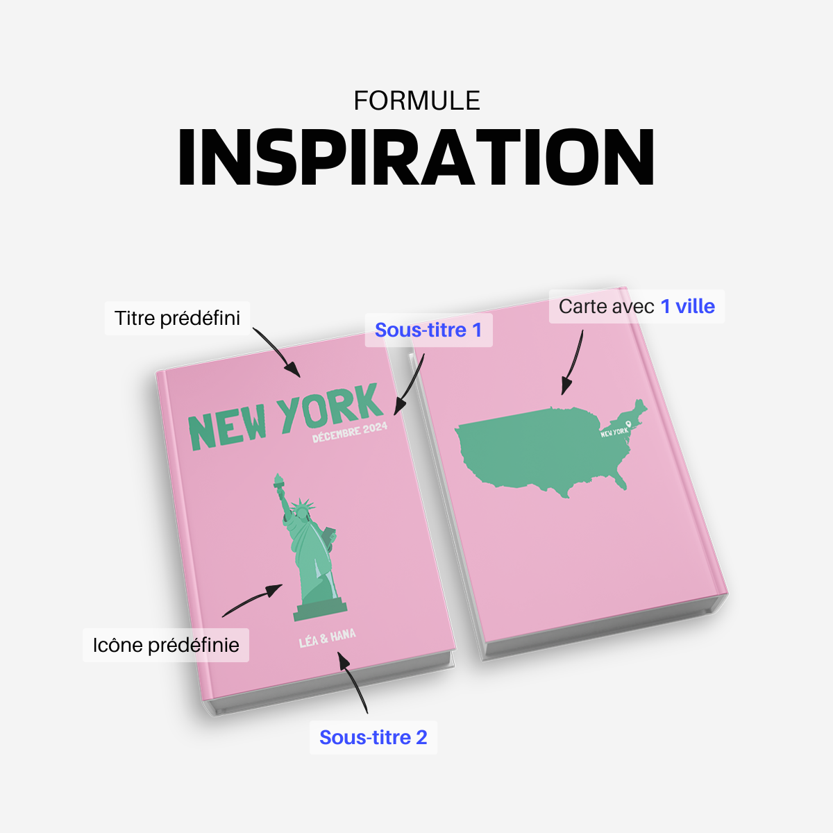 Personnalisez le titre de votre album avec le nom d’une ville, d’un pays ou même d’un événement spécial (ex. : Lune de miel, Tour de l’Asie...). Votre couverture reflètera ainsi pleinement vos plus beaux souvenirs. Certaines demandes particulières pourront toutefois ne pas être retenues afin de préserver l’esprit de notre collection.